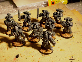 From the Space Wolves pack, I've assembled nine Grey Wolves here, making room for perhaps a Wolf Guard or one of the HQ. Assembly took a little more than 2 hours and after not having doing this for so long, I can't help but break a little sweat over this. Just warming up.....